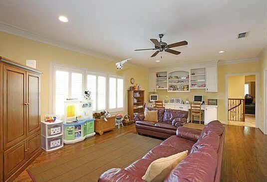 With four bedrooms, beautiful formal and informal areas this traditional Preston Hollow home provides flexibility for today's families. Hardwood floors, high ceilings, and iron staircase railing add elegance to this comfortable home. The two-story foyer is flanked by a formal dining room and handsome study that features a coffered ceiling, bookshelves, and a cast stone fireplace. Overlooking the pool and outdoor entertaining area, is a formal living room and spacious den with an abundance of natural light. Adjacent to the den is the breakfast area and gourmet kitchen with granite counters, stainless appliances, 5-burner gas cook-top, two dishwashers, and a walk-in pantry. The downstairs master suite opens to landscaped path leading to the pool and yard. Upstairs there are three bedrooms, a game room and a separate media room. An automatic gate secures the rear entry three-car garage, play area, yard, and pool. Additional amenities: sprinkler and security systems, abundance of built-ins and storage.