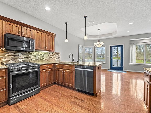 *Absolutely stunning waterfront setting with this 3600+ finished sq. ft. Quality Crafted built Ranch with 5 Bedrooms & 3 FULL Baths on a Finished Daylight Basement located in the prestigious Forest Creek at Chandlers subdivision! *Step into elegance with a hardwood floor grand entrance leading to the Great Room adorned with a stylish coffered ceiling and newer carpet on the main level. *Entertain with ease thanks to built-in speakers throughout the home and a fenced-in yard with both a deck and basketball court in the back. *The deluxe Harlan Kitchen features Granite countertops, a ceramic backsplash, and a hearth room with a cozy three-way fireplace. *The main level also features a Large Master Suite with a luxurious Master Bath, complete with a custom-tiled walk-in shower, granite counters, and a glass recessed double vanity. *Two additional bedrooms, a laundry room, a full guest bath, and a locker-bench combination in the mudroom off the garage provide convenience and comfort. *Descend to the Lower Level where endless possibilities await with a massive Rec Room area plumbed for a wet bar, full bath, 2 more potential Bedrooms, a workout room with rubber flooring and a humongous storage area. *Step outside to your shaded backyard oasis with a deck overlooking the serene water views plus a slide to take you down to ground level. *Enjoy recreational activities with a backyard basketball court (approx. 25' x 27') and take advantage of the irrigation system and underground pet fence in both the front and backyard. *Additional features include a humidifier attached to the furnace, whole house generator, and Leaf Filter Gutter Guards for easy maintenance. *Plus, take advantage of the association pond for fishing, paddle boats, kayaks in the summer, and ice skating in the winter, complete with a charming fountain. *Don't miss the opportunity to call this spectacular property home!
