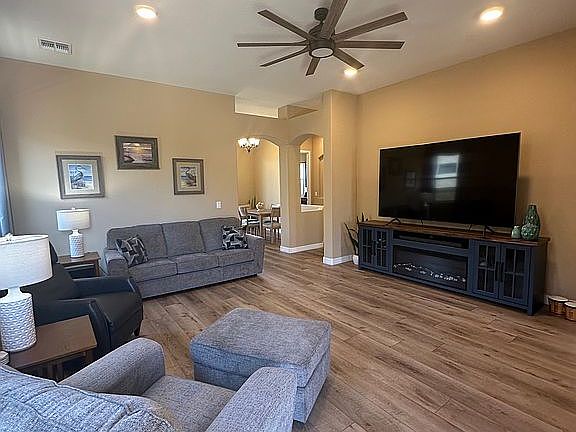 Beautiful 3 bed, 2 bath. Built in 2023. Upgrades include 42 in cabinets, granite countertops, 4 inch base, large extended garage epoxy floor. Move in ready, like new. Block fenced in yard, fully landscaped with gorgeous mountain views. Full amenities, three pools, three playgrounds, pickle ball courts, multiple gyms, free fitness and craft classes.