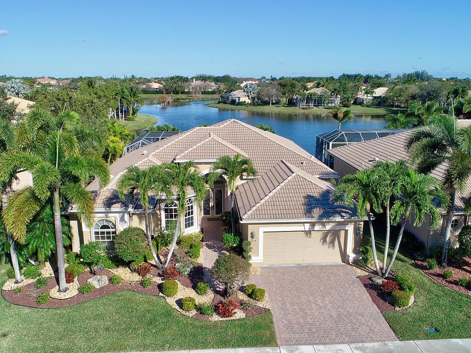 This beautiful 3 bedroom, 2.5 bath LAKEVIEW LOT home offers nearly 2,500sq/ft of living space, PRIVATE SALTWATER POOL and TONS OF UPGRADES in sought-after Bellaggio. Beautifully landscaped. Features include: upgraded kitchen with extra counterspace, electric stovetop, double wall oven, newer French-door refrigerator, dishwasher, AC, hot water heater, washer/dryer (with warranty), remote blinds in master suite and family room, and newer wood flooring throughout common areas and kitchen. Den/convertible bedroom fitted as a study or home office with custom Murphy bed, custom built-ins in family room, modern glass style fixtures throughout bathrooms and tons of natural sunlight in bedrooms. Oversized master bathroom with jetted tub, large walk in shower with porcelain tile, (MORE)