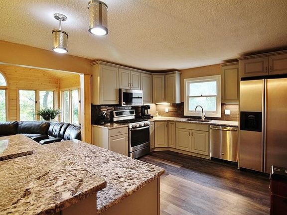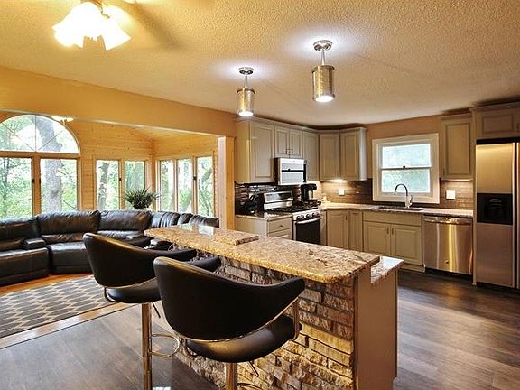 Gorgeous Hilltop Views from Waterfront Ranch Retreat Prepare to be WOWED by the hilltop views from this cottage-style home overlooking the main channel of the lake. Nearly 2000 Sq Ft, 2 BR,2 BA w/opportunity for a 3rd BR. Nestled in the woods on 2 WATERFRONT LOTS at Lake Panorama, you'll cherish the privacy and VIEWS of nature. Most of all, you'll appreciate the "treehouse" feel of the cozy, knotty pine porch w/vaulted ceiling!The charming curb appeal of the front porch & shuttered windows gives a glimpse of the nicely updated interior. High-end kitchen finishes include gray cabinets, granite counters, SS appliances, & custom island. The same detail was lavished on the 2 BA's & wood burning FP. Beautiful luxury vinyl tile floors add a rustic feel and bring natural flow from the living areas to two large BRs & laundry. Bonus!The huge garage can house your DREAM workshop & your fun-time gear. Be ready, this home is on one of the prettiest roads at the lake! Newer appliances & updates!