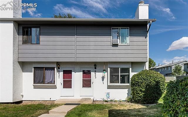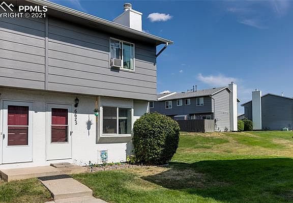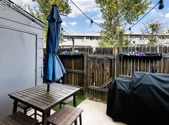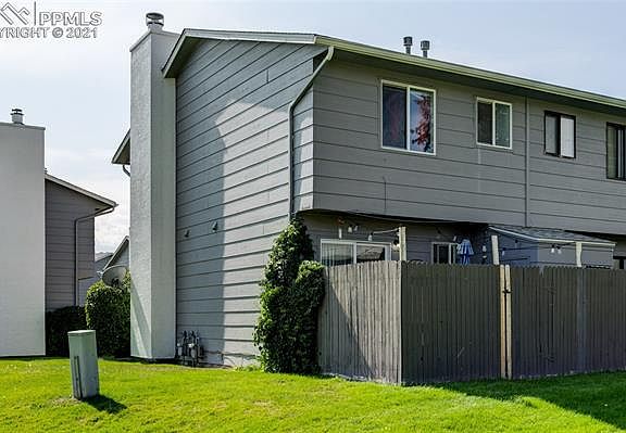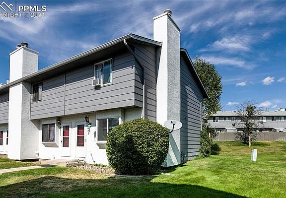 This two story 2 bed 2 bath end unit townhome includes a spacious living room, complete with manufactured hardwood floors and a wood burning fireplace to stay cozy during the Colorado winters. The bright kitchen includes the refrigerator, electric oven/range, and dishwasher. The main level also features a powder room, coat closet, and a storage area underneath the stairs. The dining area is separated by a frosted glass barn door and walks out to an enclosed back patio with a privacy fence and another storage area. The home has convenient upper level laundry with washer and dryer included. This well-kept townhome includes one assigned parking spot and is conveniently located near Peterson AFB, shopping and the Powers corridor.