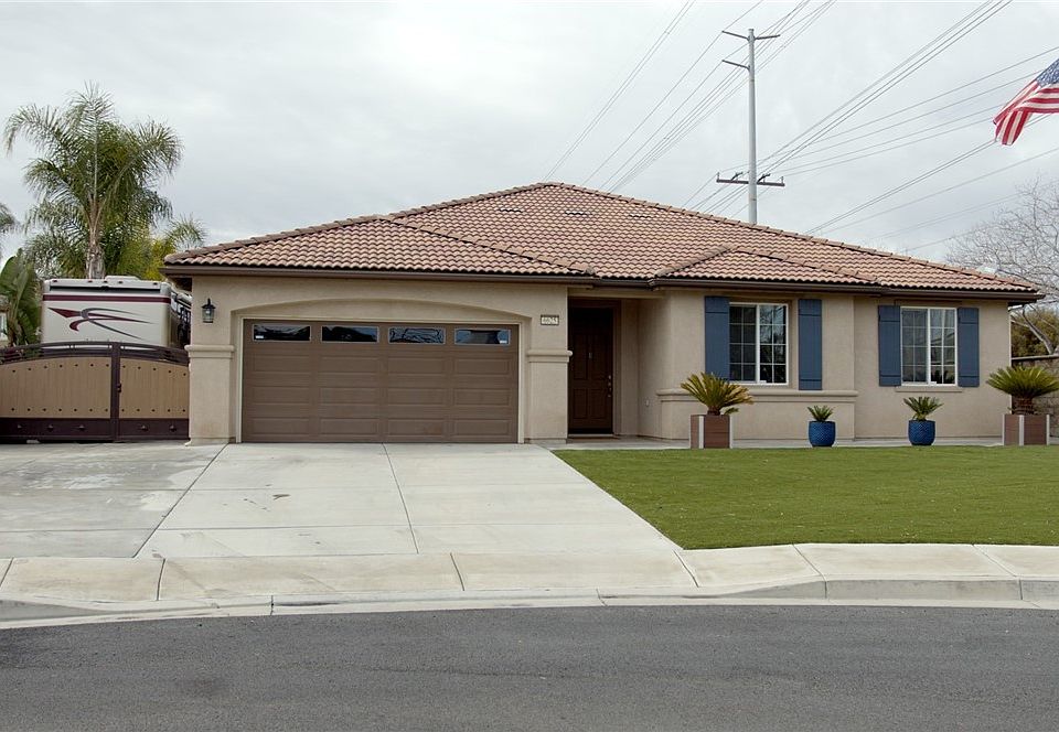 This charming home graces the quiet end of a cul-de-sac, offering single story living. Prepare to be captivated as you step into the impressive entry, where an extra wide hallway, tall ceilings and exquisite flooring extend a warm welcome throughout the main living space. This home offers three bedrooms, two full baths and a private office. Follow the expansive entry corridor guiding you to a vast and airy floor plan. Explore the roomy kitchen boasting a central island and an open view of the dining and living room areas. Adjacent, the double patio door invites you to the covered patio in the backyard, seamlessly extending across the entire back side of the home. The patio has recess lighting and ceiling fans perfect for enjoying the warm summer nights at home. Embrace the low maintenance luxury of artificial turf gracing both front and backyards of the home. Enjoy ample storage or parking space with the three car garage, while the widened driveway leads to your personal RV parking. Within a short stroll, discover the convenience of nearby pet-friendly parks and scenic greenbelts. Immerse yourself in the allure of single level living in this charming Eastvale community.