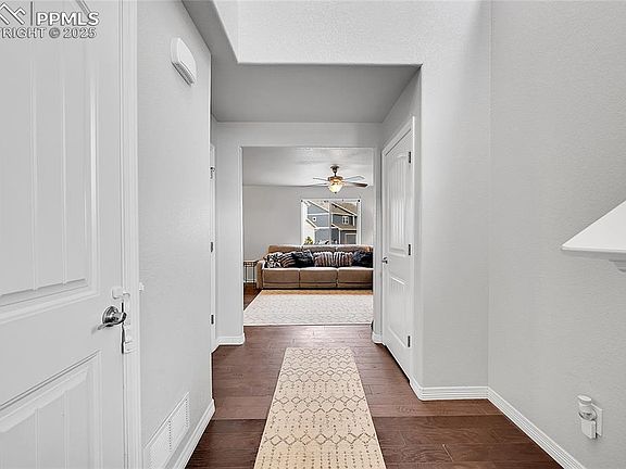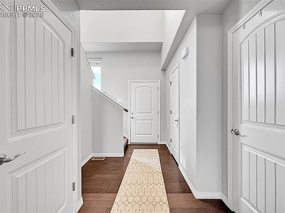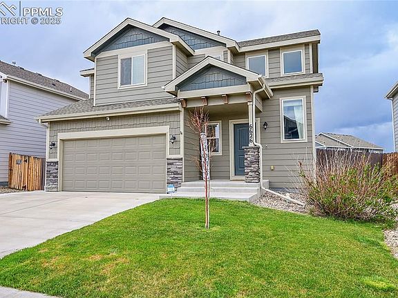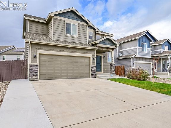 NO HOA! Welcome to this beautiful home in Carriage Meadows South at Lorson Ranch! As you walk in you'll notice dark hardwood floors and tall ceilings. The kitchen is equipped with upgraded granite counter tops, and espresso cabinets to compliment the wood flooring. As you make your way upstairs to the three bedrooms you'll notice a large primary bedroom with an ensuite and upgraded countertops. To the left is a walk in closet and to the right is your stand in shower with upgraded back splash as well. Great size backyard for entertaining and spending time outside! Close to fort Carson, Peterson, Shreiver, and the Mesa Ridge shopping center. Schedule your showing today!