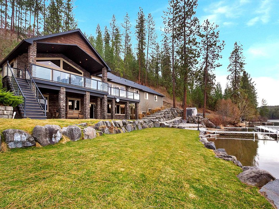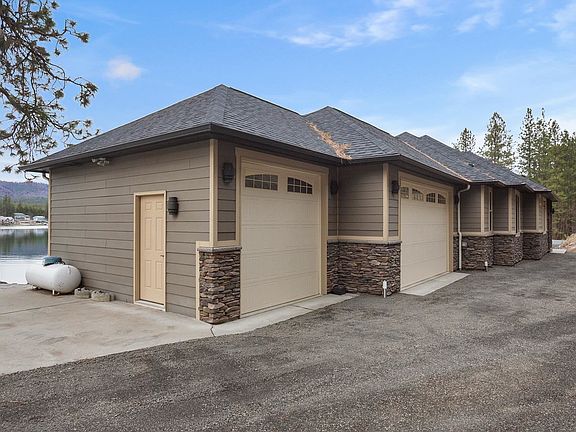 Where Sophistication & Luxury meets the lake life! Breathtaking lake views out every window. Property boasts an unheard of 210 ft of water frontage. Gorgeous soft sandy beach, 2 boat slips & 2 boat lifts (1 is hydraulic w/remote). Custom built home with tremendous attention to detail & quality. 5 bedrooms (1 no egress) + office (or another bedroom), 3 full baths all w/double sinks, nearly 3,800 sq/ft & a fantastic entertainer's layout! Gorgeous primary suite w/double doors & fully appointed en suite. Features: newer interior paint, 3 car garage, 2 fireplaces (1 is double sided to patio), cent/vac, soft close cabinets, granite, tile, hardwoods, wet bar w/dishwasher, A/C, Starlink, all newer kitchen appliances, 20+ GPM well, water softener, wired for sound, drip lines for flowers, bidets, storage shed & so much more. Super low traffic on a tucked away private road w/gated access. Only 25 min to Spokane. Wildlife galore! Such beauty and tranquility, you'll honestly wonder how you ever lived anywhere else!