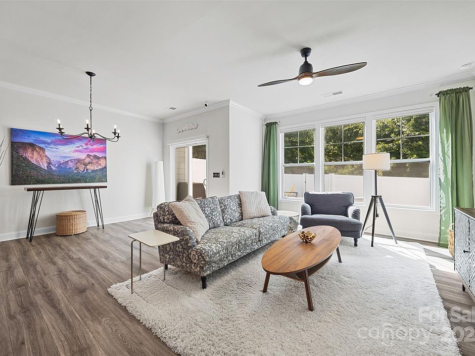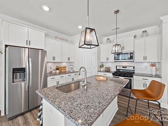 This townhome stands out with beautiful upgrades and exceptional care! The kitchen shines with an abundance of natural light, white cabinets, granite countertops, upgraded backsplash, and designer cabinet hardware, making this kitchen stand out. Up-dated custom lighting throughout, plus ceiling fans in the living room and all bedrooms. Each bedroom features a walk-in closet. This townhome is meticulously kept and move-in ready! Washer, dryer, and refrigerator (all only 2 years old) stay! Sitting on a dead-end street with minimal traffic, this townhome offers the ultimate in privacy with a fully fenced yard that backs up to the woods. The garage is well-kept and fully finished. Just minutes from the fun on Lake Wylie, shopping, dining, and top-rated Clover schools. Experience vacation living in an active community that features a beautifully designed pool area, cabana, playground, and pickleball courts. The HOA includes lawn care and trash pick-up. Located just off 49 and less than 5 miles to the NC state line.
