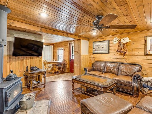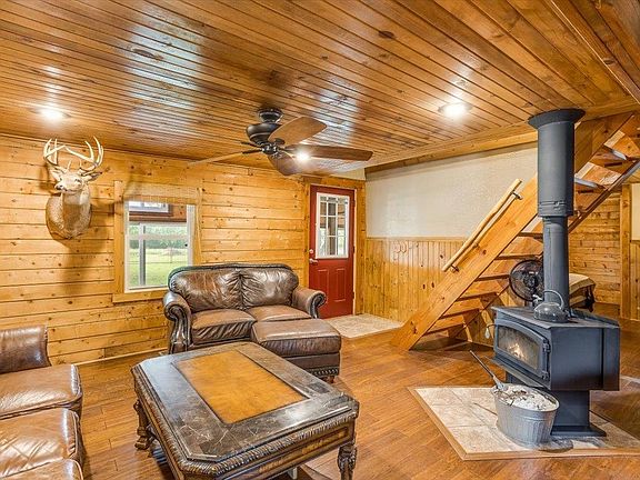 Country Living with Easy access to the turn Pike, Kansas Star and more. Over 5 Gated Acres of Fenced land. Behind the yard is thick Timbers and creek great for Hunting. Wild life Galore. Huge 24x60 Shop with RV and Welding Plugs Plus 2 more spacious sheds and Carport. Updated Swimming Pool with Decking. Log style House very rustic and Quaint. All Electric and Well Water. Great Sunroom to enjoy the peaceful views.