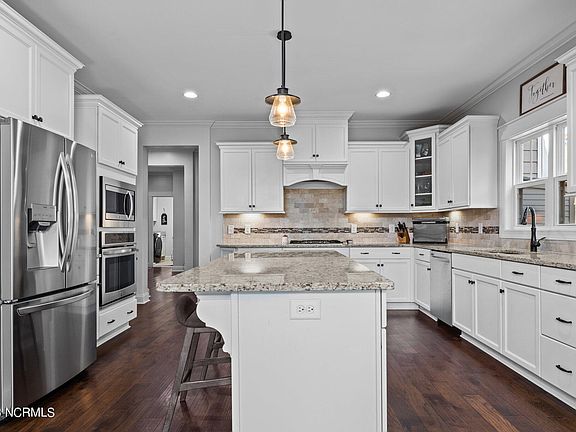 Stunning 4 bedroom 3.5 bath craftsman style home in the desirable Heronsbrook neighborhood of Whispering Pines. This is a lovely open floorplan with vaulted ceilings, wood beams and fireplace in the living room. There is a spacious dedicated office space, a large bonus room above the garage and a Jack and Jill bath between bedroom 2 and 3. This 2017 home has lovely granite countertops throughout. The kitchen boasts stainless steel appliances with a gas cooktop and a spacious island for additional seating and meal preparation. The master suite has a grand master bath, and the walk-in closet also conveniently connects to the laundry room. The back porch is partially screened in and ideal for entertaining in the well-manicured yard which includes a paved firepit and seating area under lovely pines. The Heronsbrook community also has a community pool with clubhouse, children's play area, ponds for fishing, and is conveniently located in walking distance to the Thagard Lake Park.