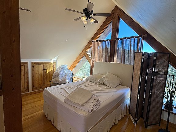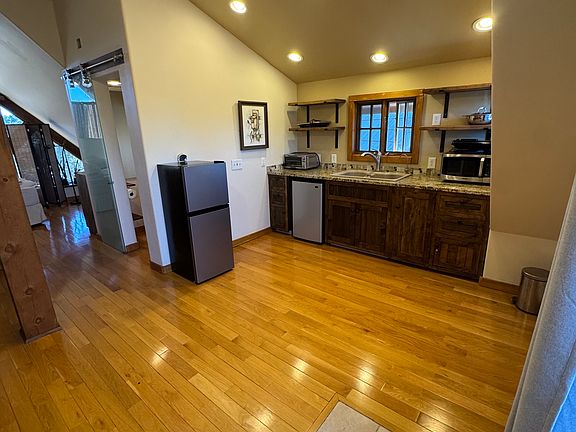 Approx. 650 sq. ft. light-filled studio with vaulted ceilings and big windows. Efficient kitchenette with sink, microwave, fridge/freezer, and room for a hot plate or air fryer worked great for the last tenant. Thoughtful layout offers a cozy living area and a sleeping nook that fits a queen (even a king); currently furnished with a queen bed, one chair, coffee table, and desk. Nice bathroom with tiled shower. Enjoy a private patio (grill allowed), one dedicated parking space, and the option for a small storage shelf in the garage. Steps from open space with great hiking.