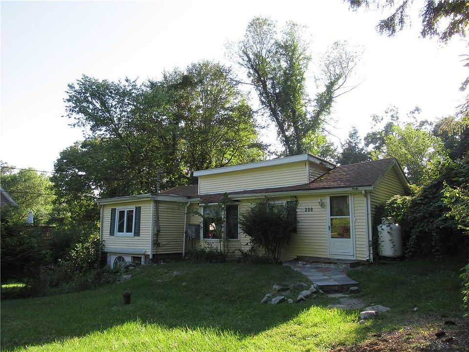 Solidly built 3 bedroom ranch in need of repair and updates! Cozy, spacious Living Room with beamed ceilings and brick fireplace with antique mantel. Light filled Dining area with bay window and plenty of room for entertaining guests. Eat in Kitchen continues with original wood beams, farmhouse style cabinets, tile counter tops, peninsula and built ins. Renovations have been started with an updated bathroom, tub/shower, vanity and toilet. A Laundry room has been added on the main floor for easy access and convenience. Primary Bedroom with 2 big closets needs a roof repair. Two more bedrooms round out this one level floor plan. Pulldown attic stairs make more storage available. Sliding glass door leads to new staircase and plenty of outdoor living space on lovely, shaded stone patio. House sits back off the road in a beautiful setting with good bones and loads of potential. Contractors and Do-It-Youselfers – this could be the one! Additional Information: HeatingFuel:Oil Above Ground,