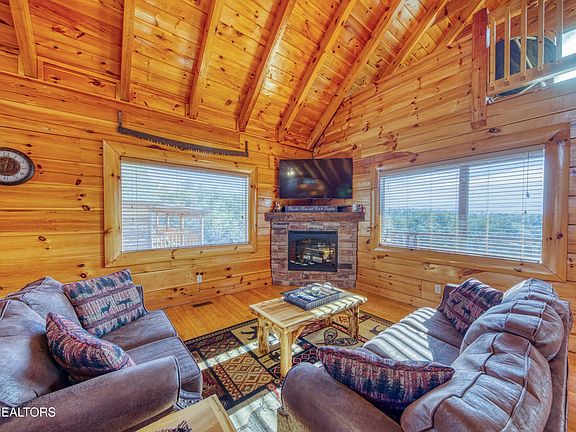 Expansive mountain views and great rental income—averaging $87,399 annually from 2022-2024! Step into this immaculate 2BR/2.5BA cabin with a creative children's loft and enjoy a smart blend of classic log cabin charm and modern comfort. The open floor plan features soaring cathedral ceilings, rich wood interiors, and large windows framing year-round mountain views. The spacious kitchen offers solid surface counters and a breakfast bar, ideal for hosting. Both oversized bedroom suites downstairs have high ceilings and direct deck access—wake up to fresh mountain air and views. This cabin will sleep 8 comfortably. Located in Grand View Resort, guests love the easy access (no steep roads), level parking, and top amenities: a large pool with kiddie area, waterfall, plus half-off zipline discounts. Relax at the cabin with a pool table, arcade, hot tub, or rock away on the deck overlooking the mountains. You can even catch Dollywood fireworks in the summer. Turn-key, furnished, and proven income producer—perfect for investors or a personal retreat.SELLER IS OFFERING TO CREDIT BUYER $10K TOWARD CLOSING COSTS. Don't miss out—schedule your showing today!