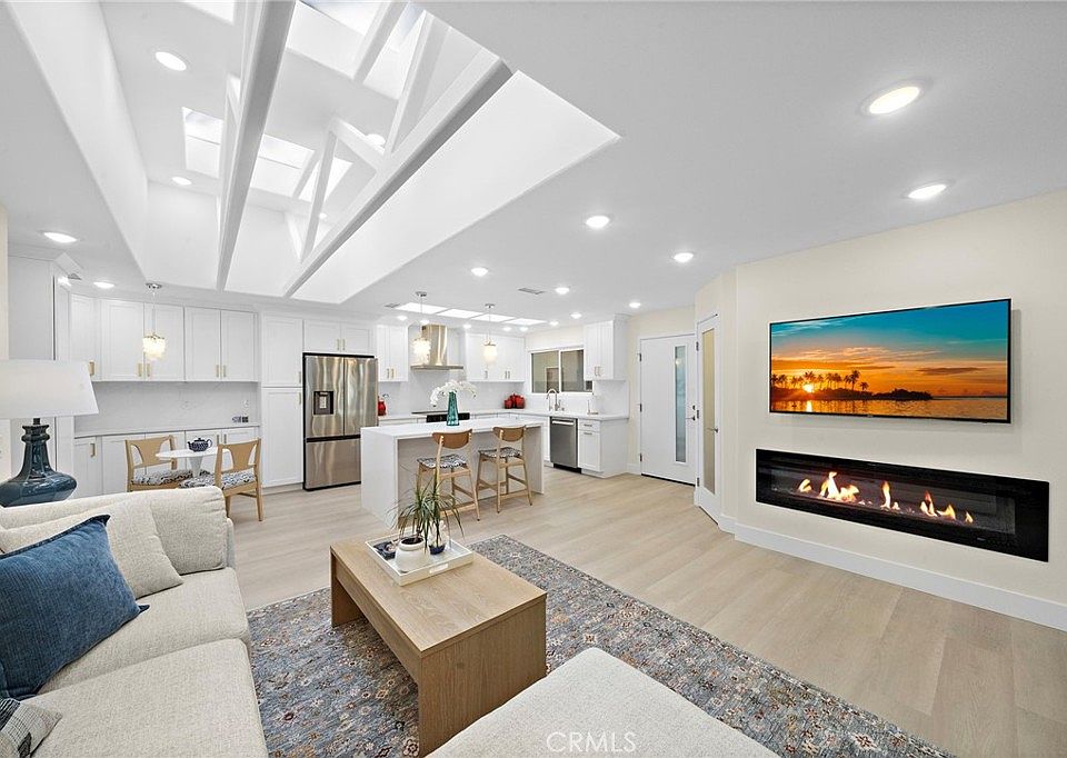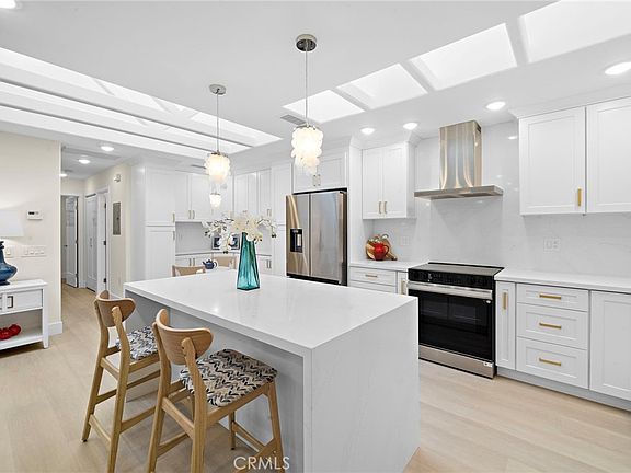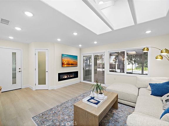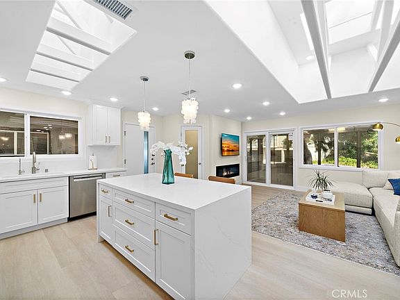Come and see this beautiful, recently remodeled, light and bright Casa Linda with no-one above and no-one below and no steps from your car to the front door. From the moment you step through the front door, you will see the magic of the lightness and brightness from the Architectural skylights! Located in the peaceful, shady, sought after area known as Nob Hill. This beautiful home was remodeled by Elegant Home Improvements- one of Laguna Woods finest builders. The kitchen area has been re-designed and is wonderful - it has been opened up and expanded - now with continuous cabinets along three walls; an expansive Waterfall Island; tasteful gold veined quartz countertops and matching quartz backsplash (no grout to clean); a walk in pantry; a white granite single sink with an under-counter Reverse Osmosis drinking water system plus this kitchen features under counter lighting. There are stainless steel Samsung appliances plus a Bosch dishwasher. The living room features an Entertainment Wall with an electric fireplace plus a T.V. access port. There is also a full-size LG washer/dryer combo unit located in the hallway. Stunning Luxury Vinyl Plank flooring is installed throughout the home. The master bedroom suite has also been re-designed and features an en-suite bathroom; a fabulous Walk-in closet along with an additional wall closet. Both bathrooms are fully remodeled and have combination full medicine cabinets behind designer lighted modern mirrors. An extra large linen closet with mirrored doors has been added in the hall. The guest bedroom has an extra large wall closet and also access to the large enclosed patio. There is a newer Central Air and Heat HVAC System. The electrical and plumbing have also been recently replaced. You don’t want to miss this fantastic home which is priced for a quick sale. The prime location close to multiple gates gives you easy access to Clubhouses 1 with a pool, a gym and more. It is also close to shopping, restaurants, medical offices, Saddleback Hospital, the post office, the freeway and more. Laguna Woods is one of the most prestigious 55+ communities in Orange County. In Laguna Woods you have access to: bus system around the community & to area shopping, restaurants, medical facilities; 5 pools & 4 hot tubs; golf, tennis, library, 7 clubhouses, 200+ clubs, 3 fitness centers, theater, horse back riding/stables, garden centers, basketball, card rooms, billiards, bocce ball, art studios, Emeritus classes & more!