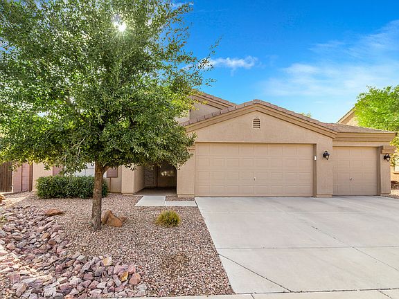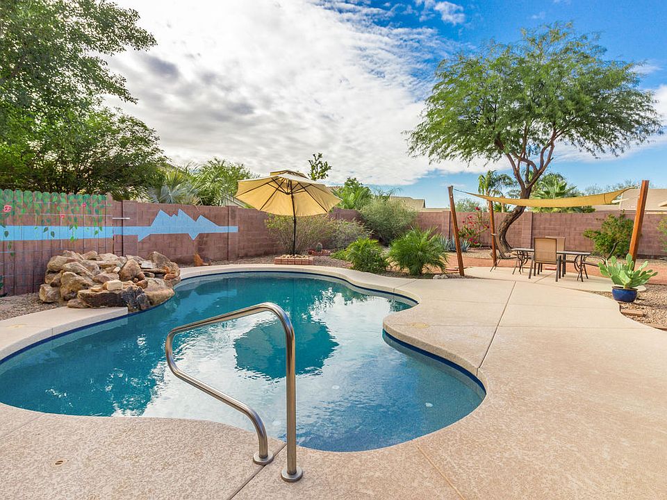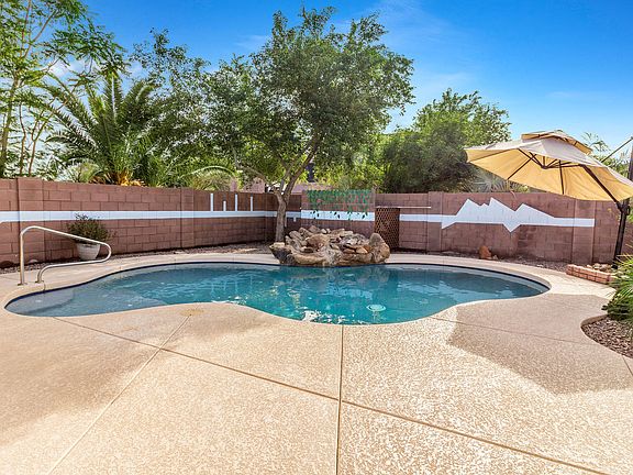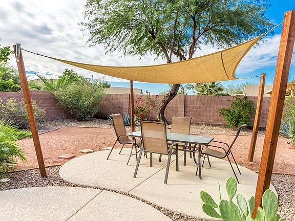 Everything you need is in this 4 bedroom 2 bath home at Copper Vista. Covered entry w/ beautiful security door, tile in all the right places, ceiling fans andsunscreens for savings. The kitchen has granite, all appliances including fridge, pantry & island with room for seating. The master is large with a spacious walk-in closet and bath w/ separate shower/tub and double sinks. The Backyard is a great place to relax on the extended patio overlooking the sparkling pool or in the hot tub. Behind the drive thru gate is a large storage building and gardening tubs. The 3 car garage has wash tub for clean ups, storage cabinets, shelving and a service door to backyard. One bedroom has a Murphy bed and there's a safe for your valuables included. All on a Large 9364 sqft lot. Look for the *3D-Tour