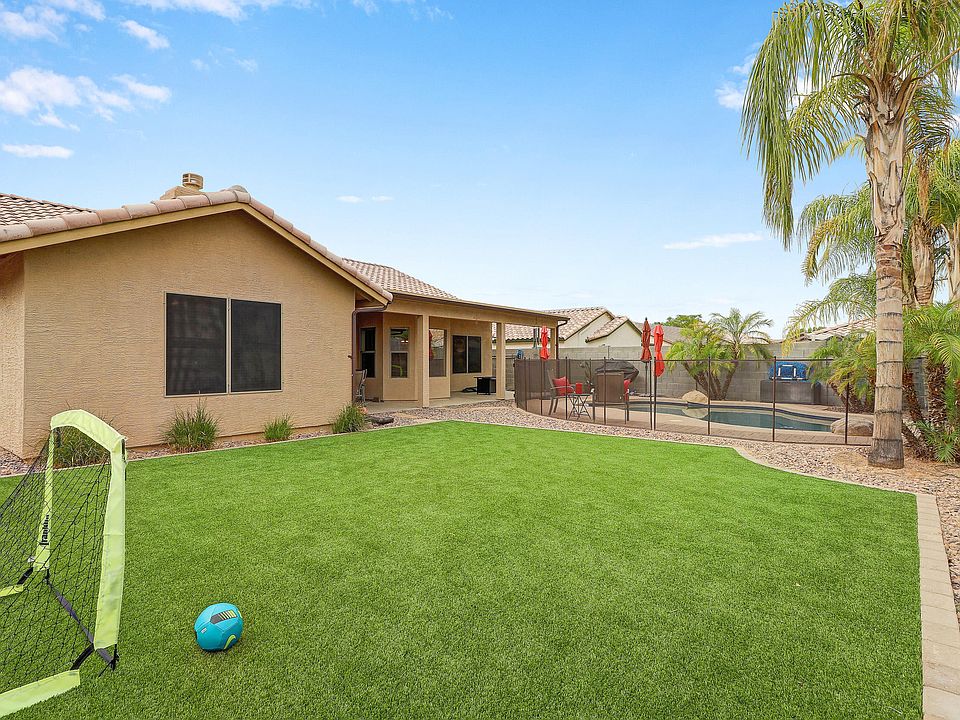Beautifully kept three bedroom, two bath home with a bonus room/ office in the perfectly located neighborhood of Corona Del Monte. Spacious open floor plan, vaulted ceilings, updated kitchen, antiqued kitchen cabinet finishes, granite tops and breakfast bar. Separate living area, dining area, private split master suite with spacious master bath, garden tub, soft water system, new carpet, tile in common areas. Amazing backyard with low maintenance turf, xeriscape, fenced Pebble tec play pool, and covered patio. Garage has storage galore with extra cabinets and ceiling rack. No HOA, neighborhood is conveniently located close to Power Rd Park and Ride, freeway access, medical care, shopping, restaurants, schools, worship, and parks. Don't miss this home!