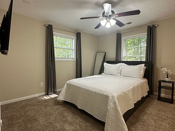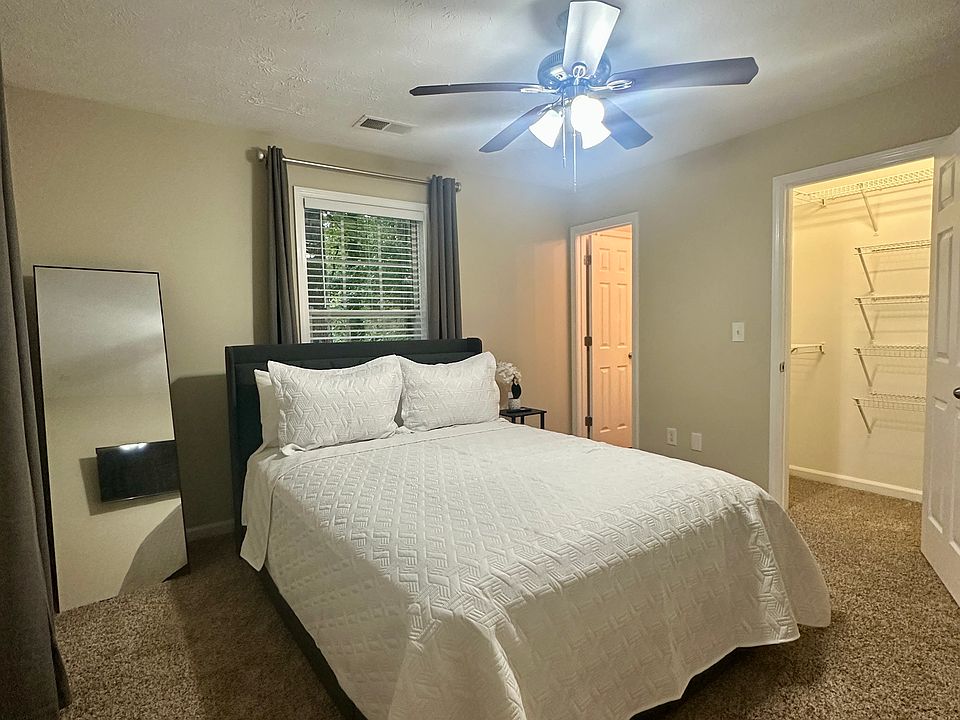 This spacious owner's suite on the main level offers complete privacy and premium comfort. The room features new carpet floors, a large walk-in closet, and oversized windows that fill the space with natural light throughout the day.