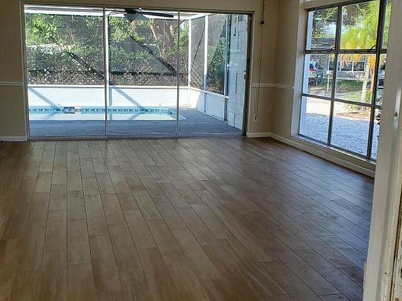 Great Bayshore Gardens "bird of paradise" model home - plus a bonus room and private inground, caged pool. Come and see all this home has to offer - 3 bedrooms (easily 4 bedrooms if you count the bonus room) 2 full baths, new wood look ceramic tile in main living areas, brand new central air, caged pool with covered porch for awesome outdoor living!! Spend your weekends in the pool instead of mowing - yard in shell so very easy to maintain!! Great schools and community has a park, clubhouse and a Marina where you can store/drop your boat. Annual fee is included in your property taxes and that gives you access to most amenities but the Marina is extra (BUT CHEAP!!)