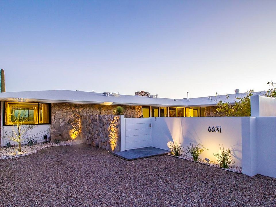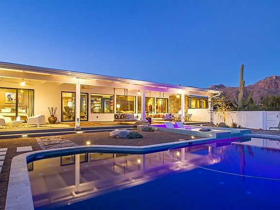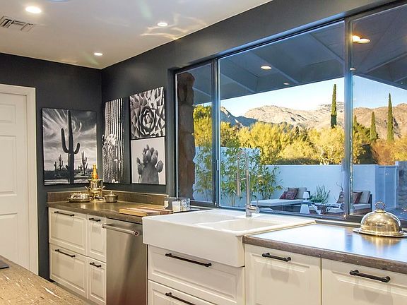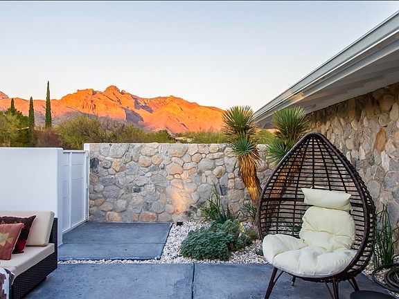 Looking for the most beautiful, one of a kind, stunning home? Picture resort-like living in Catalina Foothills in this jaw dropping hillside lot home built to enjoy views of the majestic Catalina Mountains & Tucson city scape! Mid-century modern lovers will delight in this designer home in a striking bi-level plan that features the high site. Situated on a premium lot with stunning views of the foothills and sparkling city lights, this fully updated mid century modern home offers a perfect blend of style and modernism. Nestled within the friendly community of Santa Catalina Estates, the property is perfectly situated at the top of the hill with exceptional views of both the Tucson mountains and city lights. Recently renovated, this property features a gorgeous contemporary kitchen w/ drawer storage, stainless appliances, a unique matte honed granite counter slab w/ bar seating at the cook's counter to take full advantage of the views over the front courtyard of our stunning purple mountain majesty. Finished with smooth concrete floors throughout and walls of windows, the property boasts Catalina rock wall accents and gracious living that pours out onto giant outdoor covered porch creating extra living area overlooking the heated lagoon, pool & jacuzzi, and out to panoramic views of the city, and our spacious skies. The spacious great room features soaring ceilings and abundant natural light, creating an airy and inviting atmosphere with a wood burning fireplace. Versatile living for the luxury home vacation crave. Set up a desk and work from ANYWHERE in this spacious light-filled home. Guest wing can become own suite with 2 bedrooms, wet bar + den. The all new for 1967 ''Executive Home'' in Catalina No. 4 was built by JRW Construction and Investments as a model home for their portfolio. The house and patios were featured in Phoenix Home and Garden Magazine in 2018. It was also featured on the 2017 Atomic Tucson Modernism Home Tour. The backyard is designed for relaxation and casual fun, featuring two couch swings, a wading pool, a heated diving pool, hot tub, and a fire pit for enjoying a laid-back afternoon. The outdoor space is low-maintenance, blending seamlessly with the natural desert landscape. This home is equipped with solar panels, providing energy efficiency and significantly reducing monthly electric bills. Conveniently located near La Encantada, Whole Foods, and some of Tucson's most beautiful hiking trails, this home also benefits from being in the highly regarded Catalina Foothills School District. Three of Tucson's best golf courses (La Paloma, Skyline and Ventana Canyon) are within a ten minute drive. Combining breathtaking views, thoughtful updates, and a prime location, this property is the ideal retreat for enjoying all that Tucson has to offer. Pets are welcome, making this the perfect home for the whole family. The owner covers pool maintenance, monthly landscaping and homeowner association fees for your convenience. The house is unfurnished. Please note: No smoking is allowed on the property. Renter is responsible for water, gas and electric. We have solar power so electricity is reduced. Maximum 3 pets total.