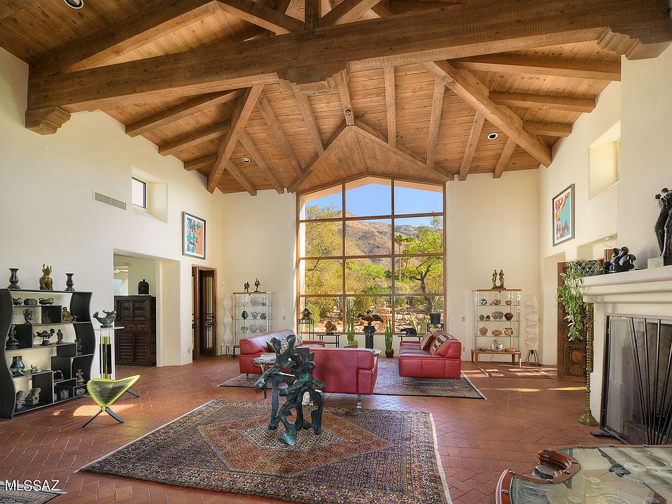 * Sellers will accept or counter offers $1,425,000-$1,495,000 for this STUNNING, one-of-a-kind ''Art as Home'' Spanish style masterpiece in prestigious, gated Skyline Country Club w/ reach out & touch the Catalina Mountain views. Gated entry w/ paver driveway leads to courtyard & into great room w/ herring-bone brick floors, soaring GORGEOUS beamed cathedral ceiling, floor to ceiling window framing the mountains, majestic fireplace, carved pillars & circular staircase leading to loft/study w/ walk-out balcony. Lovely remodeled kitchen. Family room w/ fireplace could be 3rd bedroom w/ adjacent full bath & outdoor screened-in family room w/ beamed ceiling. Cantera fireplace, carved doors, unique wrought iron, paved walkways. Words & photos can't describe the BEAUTY of this ONE-OF-A-KIND HOME!
