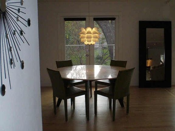 This classic 1950's mid-century modern home has been meticulously updated and expanded, and is situated on a lovely creek lot with a huge deck across the entire back of the house. Features of this home include; bleached hardwood floors throughout, and an open floor plan. The living room has vaulted ceilings, and is open to the kitchen and dining room and has full glass doors offering views of the creek. A dramatic wood burning fireplace anchors the room and creates a perfect focal point. The sizeable kitchen has floating cabinets, granite counters, and stainless steel appliances. The master bedroom is separate from the two other bedrooms, and enjoys views of the creek. The bathroom on suite has double vanities, a large shower and jetted tub. A two car carport, typical for this style of house, has storage closets across an entire wall.