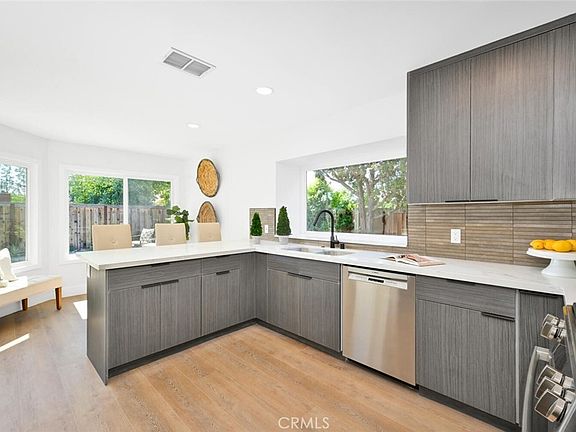 Price Improvement! Villa Park High School! Nestled in the highly coveted Mabury Ranch neighborhood, this beautifully remodeled 4 bedroom, 2 bath home is sure to impress. PERMITTED, this single-story pool/spa home has been reimagined with attention to detail. New dual pane windows, newly remodeled kitchen with European cabinetry and high-end Bosch appliances, touchless faucet, quartz countertops & butcherblock accent counter, gorgeous tile backsplash with matte black finishes. This home boasts a family room with smooth stucco fireplace, dining room and living room. The primary suite is immense with a walk-in closet, slider door to backyard with a HUGE remodeled bathroom with floating dual sink vanity, custom tile work with frameless glass shower door, large soaking tub and a private water closet. The hall bath has been remodeled with gorgeous subway tile, matte black finishes, and sleek vanity. New LVT flooring throughout. 3-car garage. Indoor laundry room. AC. Newly painted interior and exterior. New linen cabinets with European cabinetry. New landscaping with automatic sprinklers. Pool and spa newly resurfaced with pebble-tec. New garage doors, with smart technology. Possible RV parking on side of house! New LED lighting throughout, new interior doors, new hardware throughout, new water conserving fixtures and new can lighting throughout. Walk to the gorgeous Santiago Regional Park trails! Welcome Home!