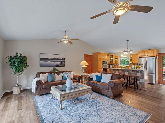 Welcome to this peaceful retreat away from the hustle and bustle of city life. Dreams come true for hobbyists with this oversized 3 car garage! As you step inside the home, you're greeted by an open and airy floor plan that seamlessly blends living spaces with the beauty of the outdoors pouring into each room. The interior boasts vaulted ceilings, warm luxury vinyl plank floors, fresh paint, and an open kitchen with stainless steel appliances. The primary suite is a private oasis, complete with his-and-hers sinks. Two additional bedrooms round out the main floor. The finished walk out lower level has a wonderful rec room that can be used as an additional family room, set up with gaming tables, the sky is the limit! Two additional rooms would make a great home office and home gym. Agent related to seller.