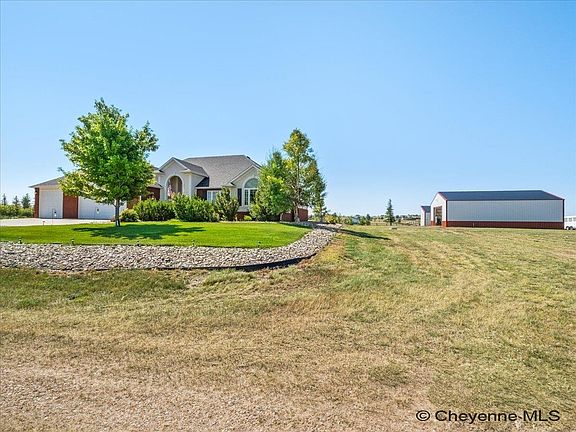 Welcome to your dream property in Bison Run! This inviting 3 bedroom, 2 bath, 3 car garage ranch style home sits on 5 acres with a large 40’x30’ outbuilding and L- shaped lean-to with tack room (5x11) for all your needs. Built in 2007, this home boasts a total of 3,618 sq. ft. The living space is designed with one-level living in mind, featuring a large kitchen with an island, multiple dining spaces, main floor primary, main floor laundry and more. The unfinished basement is ideal for extra storage or ready to be finished to add to the already optimal home. Stay comfortable year-round with central air conditioning and cozy up by the gas fueled fireplace in the chilly months. Relax in the hot tub after a long day of riding or enjoy the beautiful views of the surrounding countryside from the spacious patio. The outbuilding is any homeowner’s dream, with concrete flooring, electricity, and plenty of space for all your equipment and supplies. Whether you're an experienced equestrian or just looking for a peaceful retreat in the countryside, this property has it all. This home also features mature landscaping, sprinkler system, drip system, fully fenced yard/pasture and RV parking. Don't miss out on this rare opportunity to own a slice of paradise in Northeast Cheyenne. Schedule a showing today and make this stunning property your own!