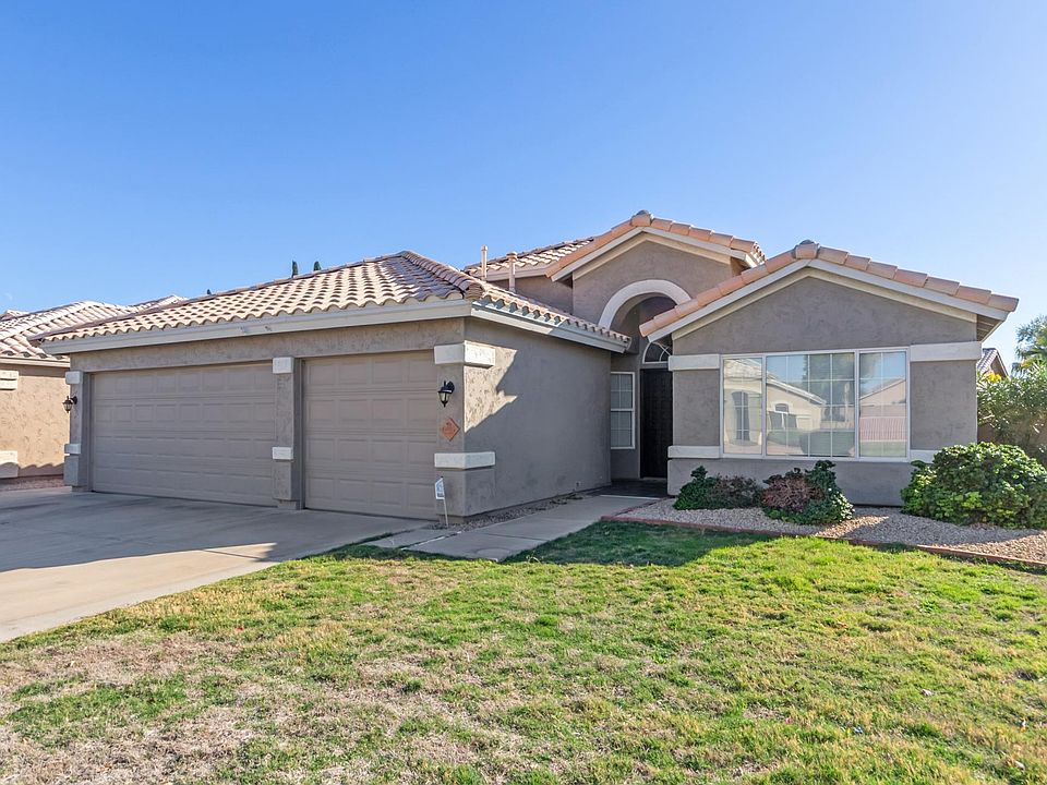 Don't pass on this stunning 3-bedroom, single-level gem in the highly sought-after Arrowhead Ranch community. This home offers a rare 3-car garage and is situated on a North/South exposure lot. Wood-look tile floors throughout the main living areas, with cozy carpet in the bedrooms. The open-concept kitchen features granite countertops, a large island, a pantry, a built-in desk area, and stainless steel appliances. Other features include vaulted ceilings and an elegant limestone gas fireplace, creating the perfect space for relaxation. The oversized second bedroom includes a large walk-in closet, while the luxurious master suite features a soaking tub, separate shower, dual sinks, and a walk-in closet. The third bedroom is versatile, flex space that could be used as a study or play room. Enjoy the backyard retreat, complete with a sparkling pool, a covered patio, a grapefruit tree. This home is located just steps away from a neighborhood playground. With pool service and all appliances included, this home is move-in ready. No smoking allowed. $55 background & credit check for each adult. Pets upon lessor approval with photo of pet. Verifiable income must be at least 3x's monthly rent, before deductions. Good credit a must.