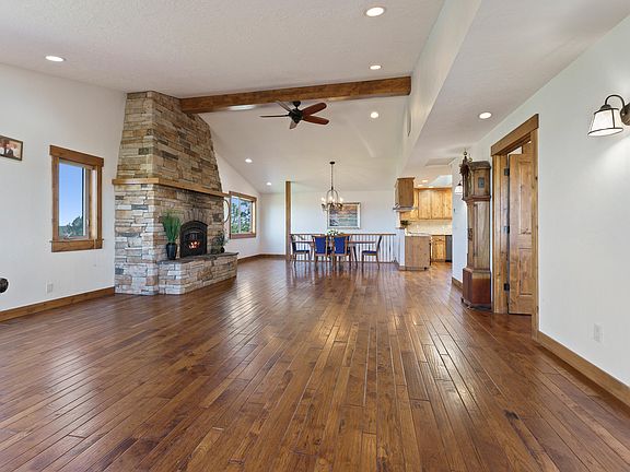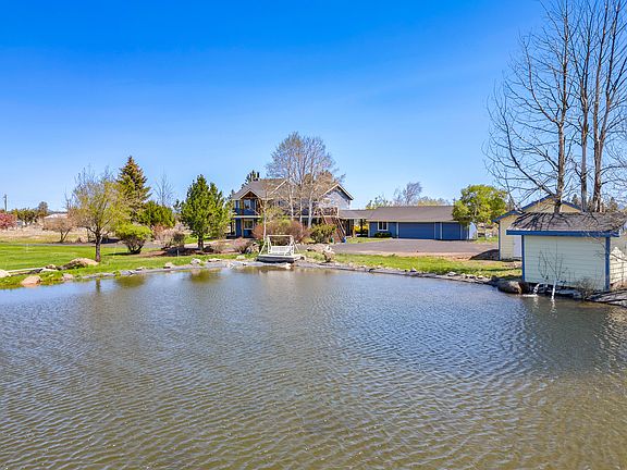 Incredible 9.5-acre property with panoramic, unobstructed Cascade Mountain views. The light-filled reverse-living floor plan showcases the big views from nearly every window. Upper level features vaulted ceilings, stone fireplace, and a spacious primary suite with walk-in closet, dual vanities, and tile shower. The kitchen includes ample cabinet and counter space, farmhouse sink, pantry, built-in fridge, and stainless steel appliances. Lower level offers a large family room, junior primary suite, and two guest rooms—ideal for multi-generational living. Outside, enjoy the view of the peaceful pond and the calming sounds of the water features from the wraparound porch! The property is fenced and cross-fenced with a riding area and animal stalls, offering space for horses, cattle, or future expansion. Plenty of room to build your dream barn or additional outbuildings. A rare combination of natural beauty, functionality, and opportunity.