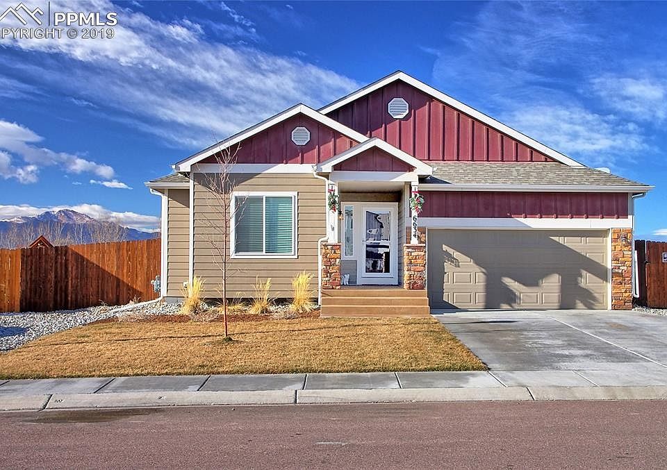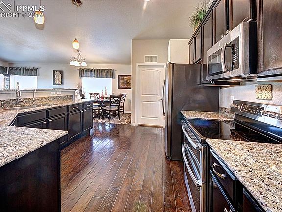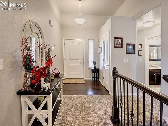 Unobstructed Pikes Peak views from entire rear of home*Immaculate home that offers total main level living*Conveniently located minutes to Fort Carson, Powers Blvd., I-25, shopping, schools and parks*Private yard with no rear neighbors. Spacious yard with an extended patio, hot tub, Pergola & a firepit*Main level features 3 bedrooms, 2 baths & the laundry room*Open & bright floor plan perfect for entertaining*Numerous upgrades include: Engineered hardwood in foyer, kitchen, dining & great room, Maple cabinets w/chrome