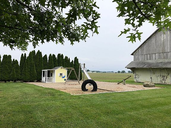Beautiful Peaceful Country setting with wrap around porch 40x32 detached 4 vehicle garage and large out building. Kids playground and small shed for storage. Inside is updated in most rooms with stained wood trim and tile/ laminated hardwood floors if you like country living this could be the place for you! New roof in 2020. Fenced in back yard.