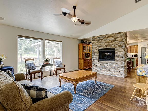 Hard to find single level home in the GREENS! This all ages community is gated and close to everything! Garrity Exit, Hospital, Shopping and more! Quality custom built- 3 bedrooms, 2 bath home. Living space with Luxury Vinyl Plank flooring, speakers and dual sided fireplace. Kitchen complete with granite counters, full tile backsplash, island and stainless steel appliances. Primary suite complete with walk in closet, dual vanities, walk in tile shower, separate water closet for toilet and tile flooring. Large covered patio to take in the view of the bluff on Ridgecrest Golf Course. Community has a clubhouse available to rent and residential RV PARKING subject to availability and additional HOA fee. 48 hr bump clause in place