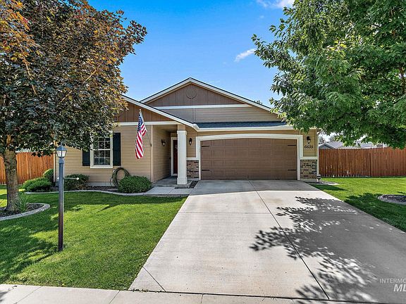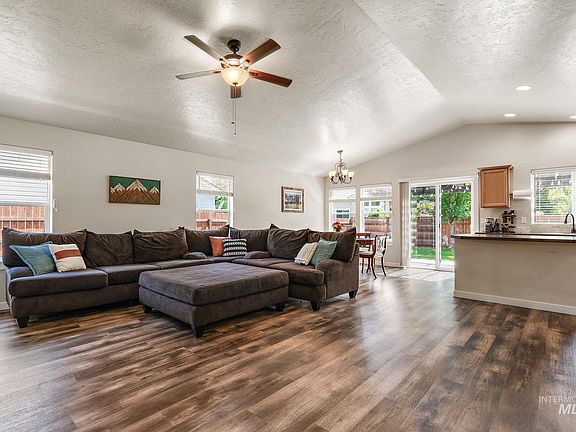 This beautifully maintained and thoughtfully updated single-level home offers a functional split-bedroom layout with an open floor plan and vaulted ceilings, creating a bright and comfortable living space. The front door opens to a hallway that leads into the main living area, where the great room, dining, and kitchen spaces flow together—great for everyday living or casual gatherings. The kitchen features LVP flooring, a pantry, and a functional island with a breakfast bar. The primary suite, set at the back of the home for added privacy, includes an en suite bath, and a walk-in closet. Laminate flooring throughout much of the home adds durability and style. Step outside to a fully fenced backyard with a lattice covered patio, built-in fire pit, automatic sprinklers, and garden area—ideal for relaxing or entertaining. A park is conveniently located one street away, plus easy freeway access and close proximity to shopping, dining, and more.
