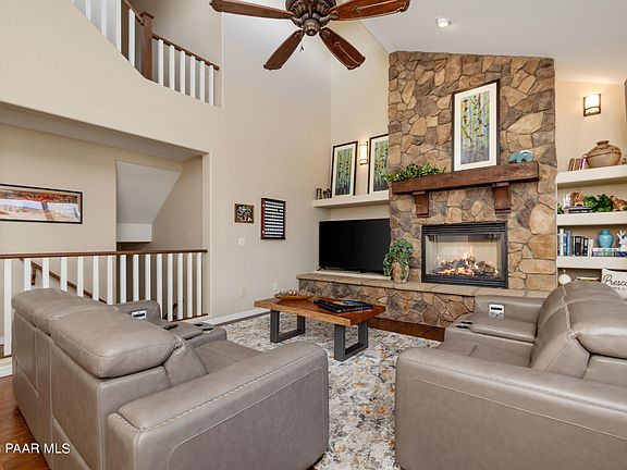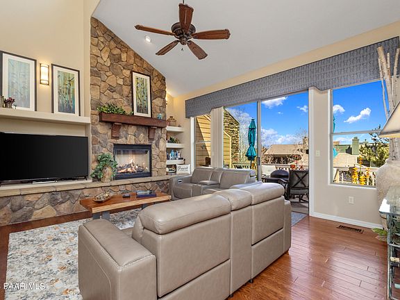 Introducing 664 Crosscreek, an exquisite townhome WITH ELEVATOR, nestled in the Aspen Creek Meadows neighborhood, one of Hassyampa's coveted gated communities. Boasting 3 Bedroom + den, 3.5 bath, 2 car garage with workshop, this home is sprawled out over apprx 3359sqft. and sits on hole #2 of Capital Canyon's Golf Course. Meticulously maintained, this trophy property is filled with natural light and soaring ceilings. The flowing layout is ideal for entertaining with an open kitchen an family room concept. The gourmet kitchen includes high end appliances with a built in refrigerator, gas range and an island, and the family room is adorned with a floor to ceiling stunning gas stone fireplace and a Sliding Glass Door that accesses views from a large deck. This rare find also includes