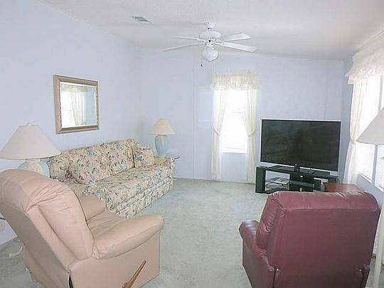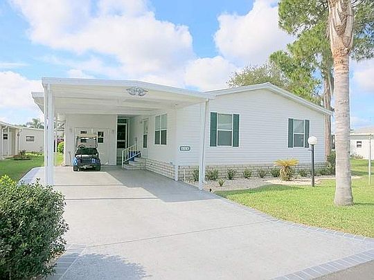 Fabulous 2 bedroom 2 bath split bedroom plan, open kitchen, dining, living room. New roof 2013, new high grade laminate 2014, golf cart storage, workshop, long drive, skylights, double sinks, walk in closet, inside laundry, enclosed Florida room, extended carport, great landscape. SB1675 Over 700 homes available at https://www.fourstarhomes.com