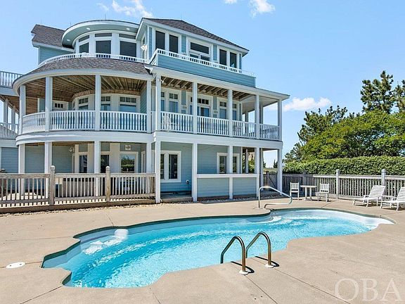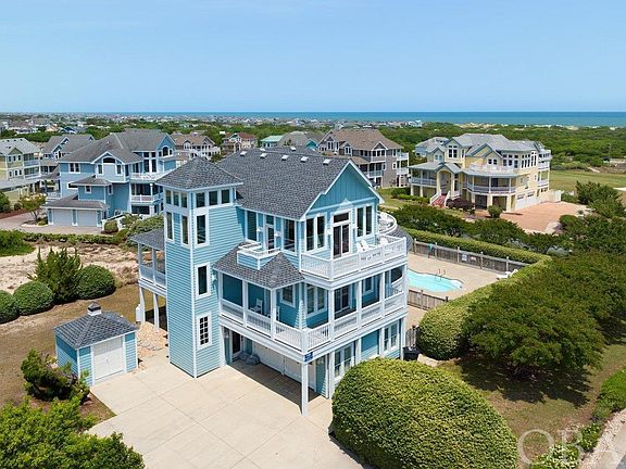 This spectacular home on one of the highest lots in the northern outer banks is a true gem, offering breathtaking views of the sound, ocean, and golf course. With 6 bedrooms and 4.5 bathrooms, a game room, and private pool, it provides the perfect space for to make memories on the Outer Banks. Nicely appointed bedrooms with new carpet, amazing natural light and beautiful baths make for a welcoming retreat. The master bath features a large tile shower and a free standing claw foot tub. The top level, completely surrounded by new windows, doors, flooring and select furnishings, has plenty of space for gathering and relaxing or for a more private space up just a few stairs to a beautiful oasis to enjoy. The views from the east and west decks cannot be matched! Also on the top level, enjoy a large kitchen, with granite counters, great appliances, a wall oven and two dishwashers. Did I mention the huge breakfast bar with plenty of room for six? Need to get away? The game room is the perfect spot for some friendly competition, while the private pool offers a refreshing retreat from the summer heat. Easily accessed from the game room the pool is just outside. With the recent addition of a shaded bar area, the choice of sun or shade is yours while still enjoying the outdoors and the beautiful landscaping this home offers. If you're looking for an investment opportunity, recent updates have increased the 2023 by more than 20%. This rental machine can be yours! Recent updates include the roof, siding, interior and exterior paint, and windows and doors on the top floor. You can be certain that this home is not only beautiful but also well-maintained. Ask about the full list of recent updates. Whether you are lounging on the deck, taking a dip in the pool, or simply enjoying the panoramic views, this home is the ultimate beach getaway. With its prime location and luxurious amenities, it is the perfect choice for those seeking a truly unforgettable home.