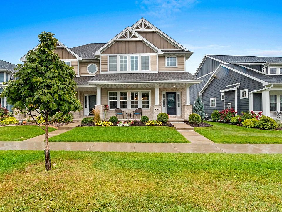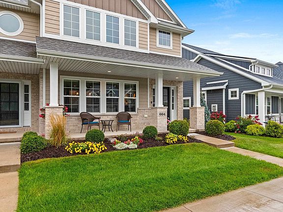Location, Location! Near Howard Commons, YMCA & Meadowbrook Park is this 2-story offering a lifestyle of ease & convenience! A zero-entry design flows seamlessly with an upper loft & egress window in the lower level preparing you for future expansion. Soaring 2-story great room with a gas fireplace adds a wow factor that carries into the dream kitchen with crisp white cabinets, pantry, center island, dry bar, granite counters & stainless appliances. Mn floor bedroom, upper loft & primary suite w/walk-in closet & tile shower are sure to please. Tasteful decor, upgraded lighting, 1st floor laundry & an insulated, finished garage complete the package. Enjoy HOA perks- lawn care & snow removal included! Walkable to parks, library, pavilion & more—perfect for low maintenance living.