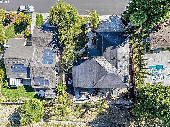 Energy efficient, two story, single-family home within Crow Canyon Country Club! This is the largest floorplan within the gates and features a 3-car garage, beautiful succulent gardens around the exterior of the property, built-in BBQ and tastefuly stamped concrete entry, back patio and driveway. Highlights include an owned Tesla solar roof, 2 powerwall home batteries (extremely useful during power outages!) and new HVAC system. Additionally, this home features a bedroom and full bath on the first floor, built-in wet bar, beautiful stone fireplaces and updated kitchen with custom cabinetry. The master bedroom turns into a retreat with a cozy fireplace, additional sitting area and spacious walk-in closet. Relax in the luxurious spa-like master bath with oversized tub, dual shower and shared master fireplace. The home is situated adjacent to open space, offering backyard privacy, lovely views of nature and conveniently located next to the community pool. This home is also located in an award-winning school district. Amenities include 24-hour gated security, open space throughout the community and several community pools.