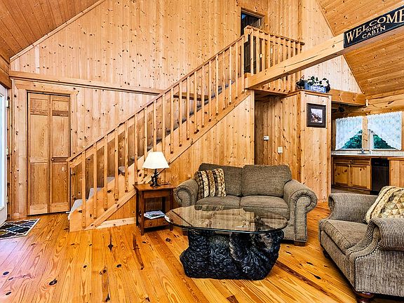 Nearly new log cabin on private 2.42 acre lot. Mountain view to rear.10 foot deep covered rear porch includes big hot tub. What a perfect place to relax and enjoy the view! Two-story Great Room offers stone gas log fireplace. Kitchen is tucked into corner and has a breakfast bar and dining area. Two bedrooms on this level share a hall bathroom. Upstairs , a master suite with en-suite bathroom and extra large WIC. The lower level is your family or extra bunk space. Full bathroom here too along with laundry and a deep storage/utility room. Deep covered patio at lower level. Fire pit in rear yard.