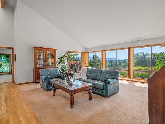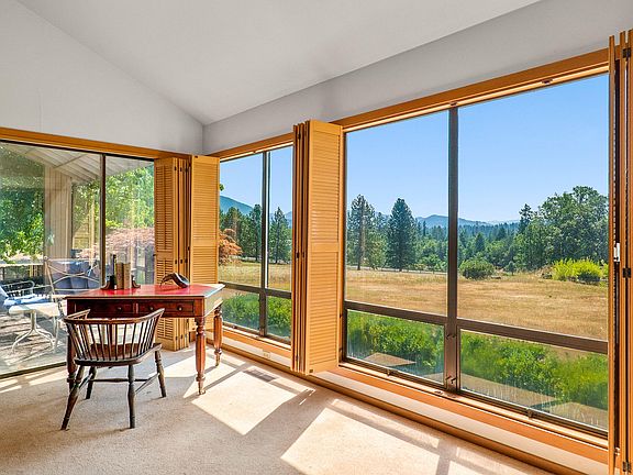 Classically designed by a student of Frank Lloyd Wright. Set on 2.73 acres, this 1,918 square foot, 3 bed 2 bath home with floor to ceiling windows has a light and bright feel with inviting outdoor elements, indoors. Enjoy the long-range views from this interesting and masterfully arranged floor plan. Extensive natural wood finishes gives this home a timeless, relaxing and functional feel. Large island in the kitchen with breakfast bar and attached dining area. Home is gated for privacy, dwelling sits off the road and the grounds are spacious with mature landscaping throughout. Relax in the outdoor seating area or at the Koi Pond in this high-end Grants Pass neighborhood. Additionally, home boasts a finished attached garage, detached shop and a finished workshop above that could flex into multiple uses. Strong wells in the area. First time this home has been on the market. Easy to show. Call or text for more information.