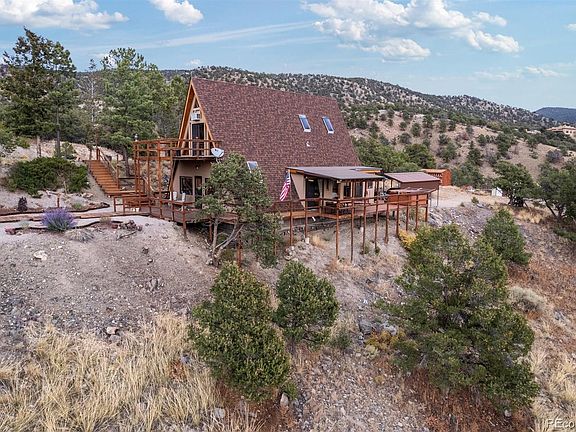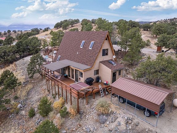 A-frame house perched in upper Pinon hills over looking the Arkansas River Valley. This rustic A-frame is constructed using a durable stucco, providing a resilient but cozy home. As you enter the house a hallway introduces you to the primary and a secondary bedroom that can be used as office space. You also come across the first floor bathroom with a large shower and impressive vanity. The end of the hallway places you in a homey living and dining space, with a small yet well equipped kitchen tucked in the corner. The entire first floor is encased in a large deck that can be used as outdoor living space to enjoy the beautiful Colorado weather. Following stairs to the second level, you enter a cozy living room with floor to ceiling windows providing incredible views of the mountains surrounding Salida. This second level features a handy bathroom and inviting bedroom serving as an escape from the craziness of the outside world. This house is placed upon a 1.2 acre plot of land and adequate space for outdoor storage, with an abundance of beautiful Pinon trees dotting the property. This delightful A-frame is a sanctuary that invites you to embrace the serenity and grandeur of Colorado living.