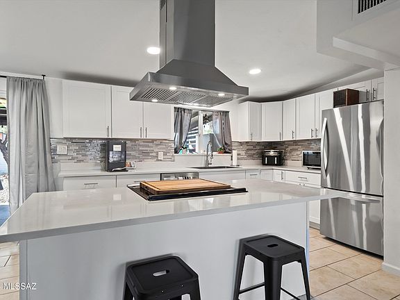 Gorgeous, Move-In Ready Home in Terra del Sol. Fully Remodeled in 2022. Beautiful Chef's Kitchen w/ Quartz Tops, Large Island, White Shaker Cabinetry, Subway Tile Backsplash, SS Appliances, Stylish Vent Hood & Brushed Nickel Hardware. Custom-Tiled Showers, New Toilets, Mirrors, Brushed Nickel Fixtures & Modern Lighting. Heat Pump Installed in 2021. Dual Pane Windows, New Doors & Hardware. Tile Throughout Entire Home. Laundry Room with Stackable W/D - Included in Sale. Secure Wrought Iron Fencing Around Front Yard & Block Wall with Double Gated Entry to Backyard. Parking Space for a RV, Boat or Extra Vehicles. Great Eastside Neighborhood w/ Community Pool & Parks. Excellent Location Near Dining, Shopping & Entertainment at Park Place Mall & Davis Monthan Air Force Base. Go Show Today!