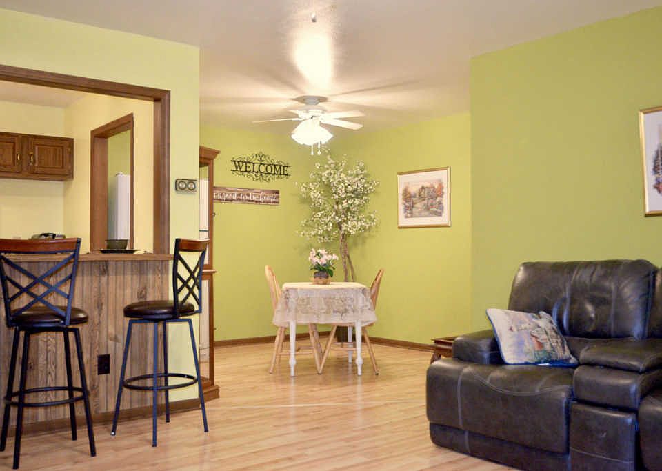 Spacious, Open Condo Conveniently Located. Stair-less First Floor two bedroom one bath condo. Spacious Master bedroom with huge Closet. Nice flow from Kitchen through the Dinning and Great room that opens to the Patio doors allowing in plenty of energy, natural light. Power Awning to lower for shade as well when needed. One and 1/2 car garage plus an assigned parking space is included. Breakfast bar, all appliances included, oven, range, microwave, refrigerator, dishwasher, disposal, and full size washer and dyer! Ceiling fans and window treatments included. Newer laminate flooring that flows through the Living, Dinning, hall and bedrooms with ceramic tile in foyer and bathroom! 1 Yr Home Warranty included! Don't wait, set your appointment today.