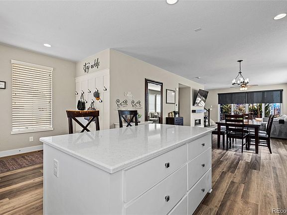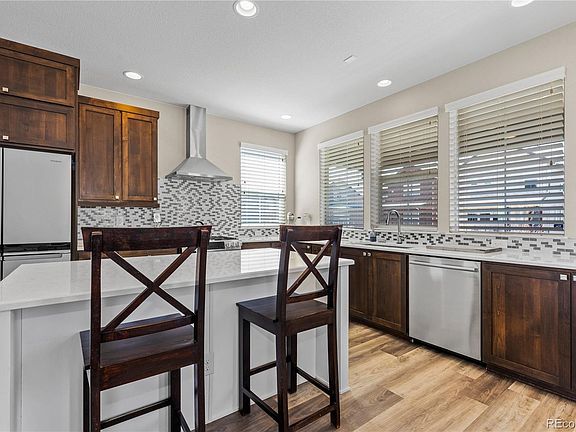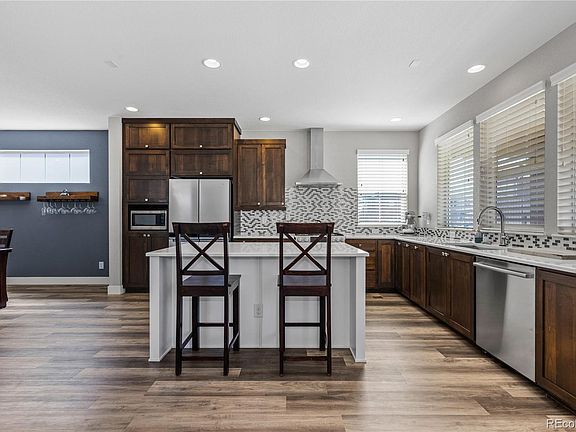 Some homes have all the luck. This home seems to have won the Midtown lottery—with a rare and delightful backyard featuring evergreen and deciduous trees; a lush, irrigated lawn; a multi-level deck with a herringbone-pattern surface; and raised garden planters. Inside are even more lucky breaks: A wide-open main level shines, particularly in the gleaming kitchen with large banks of elegant cabinetry, ample counter space, and a huge quartz island. Time spent in your sunny, spacious living room will center around the stylish fireplace—or perhaps you’ll head out through the exta-wide sliding glass doors to entertain outside. Upstairs, a roomy primary suite includes a huge picture window, a walk in-closet with built-ins, and a luxe bathroom. Two additional bedrooms on this level share a beautiful Jack and Jill bath. The fully finished basement lets tons of light in, thanks to walkout egress windows and two more bedrooms, giving you work-from-home and guest-room options. The basement bathroom is a showstopper, with designer tile and finishes plus a rain shower. Another perk: a front-pull-in garage with a workbench and tons of overhead storage. A location on the west side of the neighborhood means you’ll also be close to the amazing Home Plate Park, a dog park and Trailside Academy K-8. Also nearby is the popular neighborhood brewery, trails, bike paths, and the community clubhouse and gardens—as well as four major highways to zip to downtown Denver, metro destinations, or the mountains beyond.