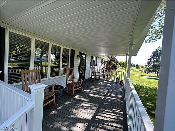 Lovely maintenance free home “move-in” ready. Convenient floor plan w/first floor laundry and huge master suite w private bath and walk-in closet. Cozy covered back porch over looking large level one acre lot. 2 car attached garage, 1 car additional detached garage great for storage. Full basement w high efficiency heat pump - cools in the summer, heats in the winter, all electric, low utility bills, new hot water tank, new gutter guards, sump pump w/back up battery in case electric goes off. (Battery may need replaced as seller has never used it Home is located just minutes from Salt Fork State Park and Interstate 77.