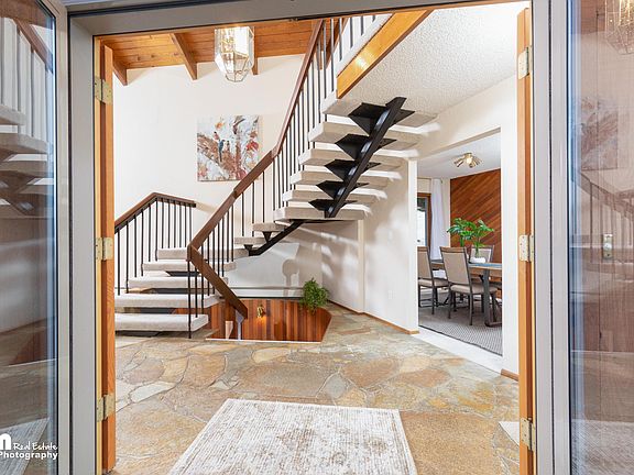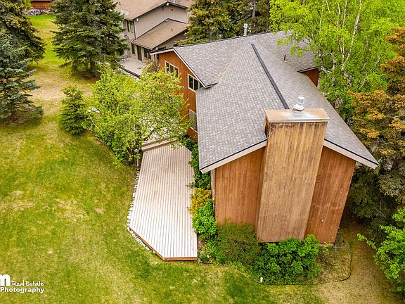 Custom cedar home on rolling, park-like .61 acre lot in desirable Valli Vue subd. Through-the-trees view of city & inlet features stunning sunsets. Dramatic two-story great room & entry with huge windows, massive exposed beams, tongue & groove ceiling, & spectacular open staircase to 2nd floor & finished basement. Spacious kitchen with large island, shaker-style natural cherry cabinets & granite