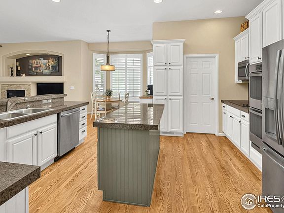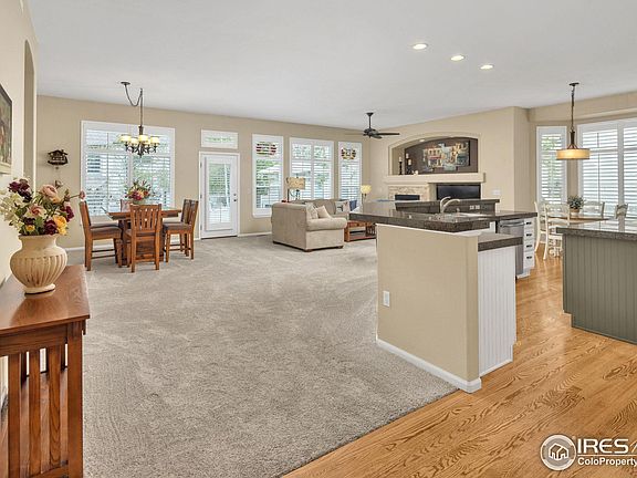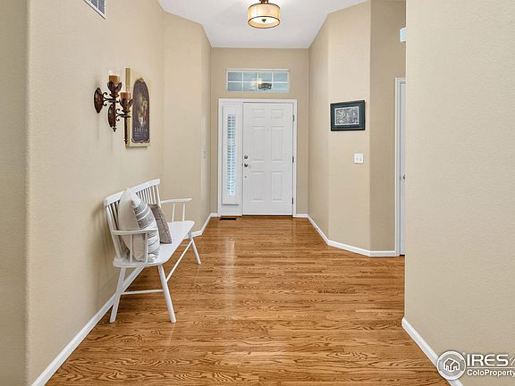 Enjoy easy living in this sprawling, south facing ranch offering over 4300 finished square feet. This lovingly cared for home is ultra clean, pet free, and in a neighborhood you'll love to live in. The wide open design is welcoming and sun lit with a wall of windows adorned in plantation shutters, a gas fireplace and some of the most amazing carpet your feet have ever walked on! The striking kitchen with two terrific islands, double ovens, pantry, shining oak flooring and two dining areas is great for hosting large holiday dinners. The primary suite will awe you with French doors, massive 5-piece bath and sizable walk-in closet. Bedroom 2 is bathed in sunlight and sits at the front of the house. French doors introduce you to bedroom 3 which makes it a fantastic home office. Situated perfectly between the 2 bedrooms is a full bath with double sink vanity and tub. The basement is professionally finished to include an enormous guest suite, massive family room and a huge flex space perfect for a game room, home gym or 5th bedroom. Summertime is the right time out your back door with the expansive concrete patio, mature trees, shrubs and beautiful Xeriscaping. You'll appreciate the oversized two car garage (474 sq ft), storage shed and very useful and spacious crawlspace. There's always something to do in St Vrain Ranch with Patterson park just a few steps away, two additional parks, community walking path, dog park, and the Carbon Valley Regional Library & disc golf course just across Sable Ave (all this with NO METRO TAX and HOA is only $350/year). Walk or bike to Prairie Ridge Elementary, Coal Ridge Middle, King Soopers shopping center, Firestone Sports Complex and Saddleback golf course. Just minutes to I25 and a quick commute to Denver, Ft. Collins and Boulder.