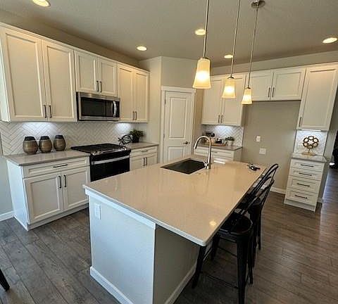 Ready now! Fairplay ranch plan in the Greenways at Sand Creek neighborhood. 4 bedrooms, 3 baths, 2 car garage home. The kitchen features white cabinets, cool Simply Grey Quartz countertops, pantry, and stainless steel appliances including a gas range. Conveniently access the expanded patio from the dining room through sliding glass doors. The master bedroom is separated from the master bath by a barn door. The master bath features a large shower with seat and sleek frameless shower surround, double sinks, and larger walk-in closet. Garage includes 4' forward extension to accommodate longer vehicles or provide valuable storage space. The finished basement has 1' taller walls and hosts a large rec room with wet bar rough-in, two bedrooms and a full bath. Home comes equipped with smart home package and air conditioning. Seller incentives available.