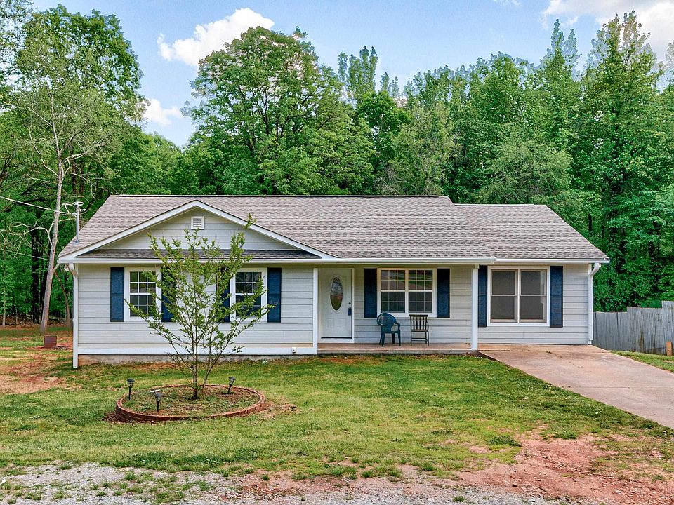 Welcome home! This charming 4 bedroom/1.5 bath ranch-style home is situated on a 1.11-acre lot, offering the perfect balance of privacy and convenience. As you enter the home, you will be greeted by a spacious and inviting living room with large windows that let in an abundance of natural light. The living room seamlessly flows into the dining or den area with a gorgeous vaulted and beamed ceiling, providing the perfect space for entertaining guests. The recently updated kitchen features new countertops and backsplash, and plenty of cabinet storage. The primary bedroom is spacious and offers an en-suite half bathroom and walk-in closet. The three additional bedrooms are bright and cozy, with plenty of natural light and ample closet space. The full bathroom is conveniently located in the hallway near the other bedrooms. Step outside onto the back deck and enjoy the serene views of the wooded backyard, perfect for relaxing and enjoying the outdoors. The yard is large enough to host family gatherings or for your furry friends to run around and play. Other notable features of this home include a large storage shed/shop and updated flooring throughout the home. The location is unbeatable, with easy access to Highway 400 and Hwy. 53, local shops, restaurants, and Lake Lanier. No HOA!