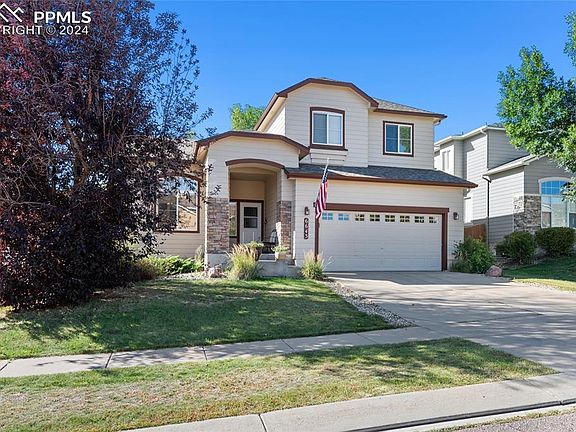 Welcome to this stunning two-story home in the highly sought-after Ridgeview neighborhood of Stetson Hills! This beautifully finished 5-bedroom, 4-bathroom residence spans 3,166 sq ft and sits on a generously sized, landscaped, and fenced lot. As you enter, you’ll be greeted by vaulted ceilings, abundant natural light, and gorgeous hardwood floors. The inviting living and dining rooms flow seamlessly into the expansive kitchen, a chef’s dream featuring ample cabinetry, tiled countertops, a center island, vaulted ceilings, and stainless steel appliances. The cozy kitchen nook opens up to a huge, level backyard, with a large concrete patio perfect for outdoor activities, pets, gardening, and enjoying Colorado’s beautiful weather. Just a few steps down from the kitchen, the spacious family room boasts a gas fireplace and plenty of natural light, complemented by stylish custom wood blinds. The main level also includes a convenient laundry room and a half bathroom. Upstairs, the massive primary bedroom is a luxurious retreat, complete with a 5-piece ensuite bath featuring a beautifully tiled shower, a soaking tub, dual sinks and a walk-in closet that offers ample storage space. Additionally, you'll find two more bedrooms and a full bathroom on this level. The finished basement is a standout feature, offering a 24'x20' family or recreational room with an insulated ceiling, plus two more spacious bedrooms and a full bathroom. For added comfort, the home is equipped with Central Air, a whole house humidifier and the water heater was replaced in 2021. Other highlights include an insulated and drywalled 2 car garage, tons of professionally built in storage in the garage while still being able to fit 2 full sized vehicles inside and a prime location. Enjoy easy access to St. Francis Hospital, D-49 schools, the Powers Corridor, shopping, dining, parks, trails and much more! Discover the perfect blend of comfort, style, and convenience in this exceptional home!