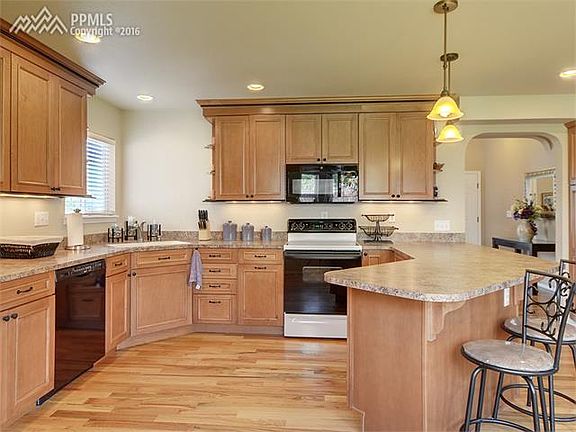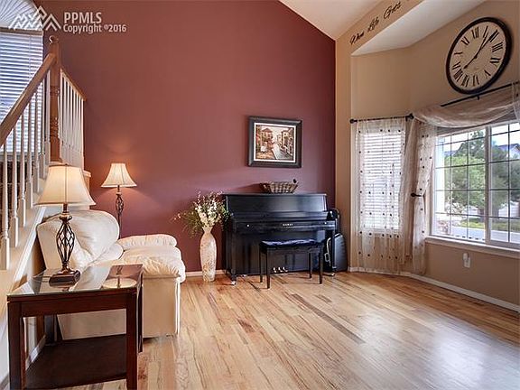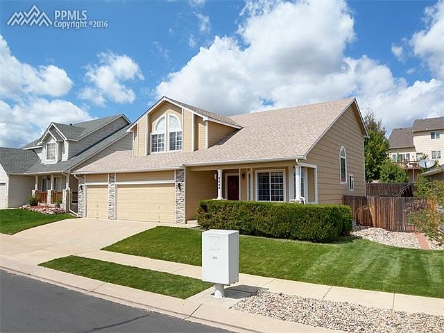 Quality, upgrades and technology define this beautiful 2 story home. The exterior has been freshly painted and features a new high-impact roof. Additional features include new premium carpet throughout the home, central air conditioning with an upgraded electrical panel and surge protection, a new high-efficiency dual-stage furnace with smart thermostat and high-capacity water heater. The custom kitchen features new dark stainless steel appliances. The main level contains stunning hardwood floors, dual staircases, spacious kitchen and formal living areas with a gas fireplace in the family room. The upper level features 3 very large bedrooms including the master suite and two baths. The master bedroom has a stunning, unobstructed view of Pikes Peak. All rooms are freshly painted. The fully-finished basement features a great room with gas fireplace, spacious bedroom, remodeled bath and very large multi-purpose area for an office, personal gym or kids play area. Outside features a large back yard with smart, high-efficiency, computer-controlled sprinklers, three-car garage and an over-sized patio. Orientation is perfect for solar power. This house is a must see!